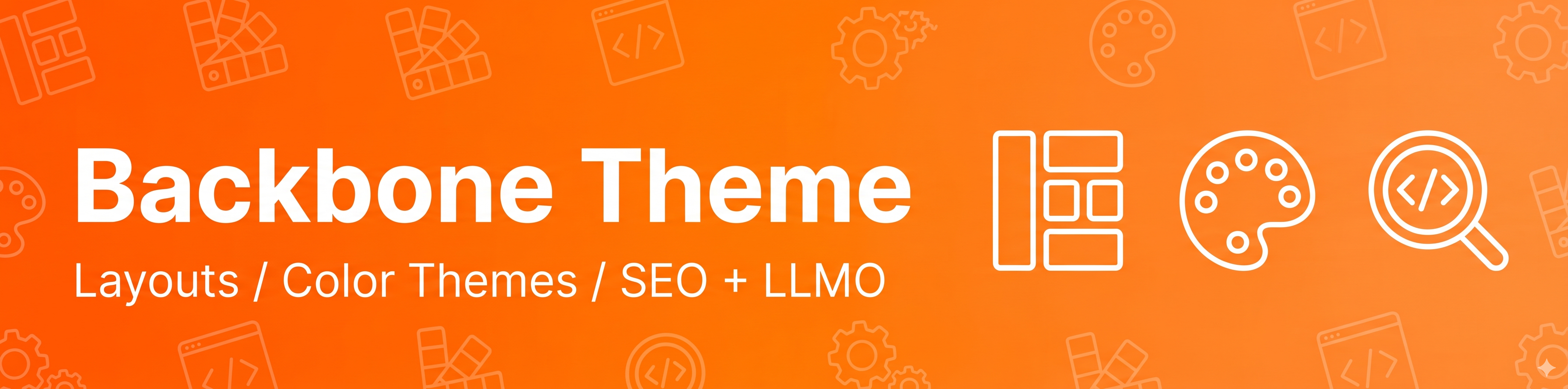 Backbone Theme は「テーマは基盤(Backbone)、プラグインで拡張」という思想に基づいています。テーマ単体でサイトの見た目・レイアウト・基本SEOを完結させ、高度なSEO・LLMO・GEO・AIO(AI Optimization)機能は専用プラグインで後付けする構造です。